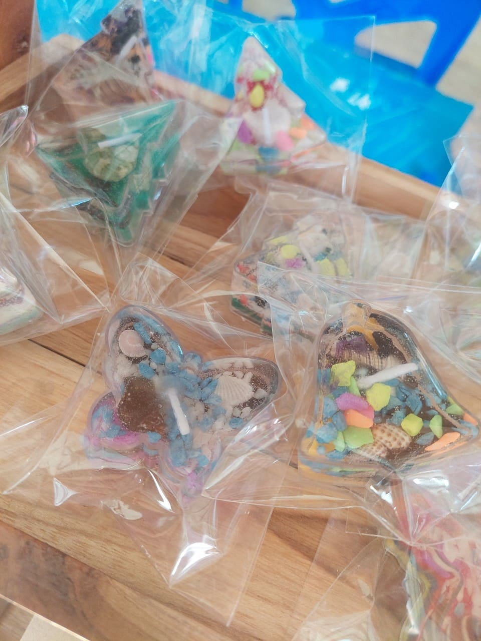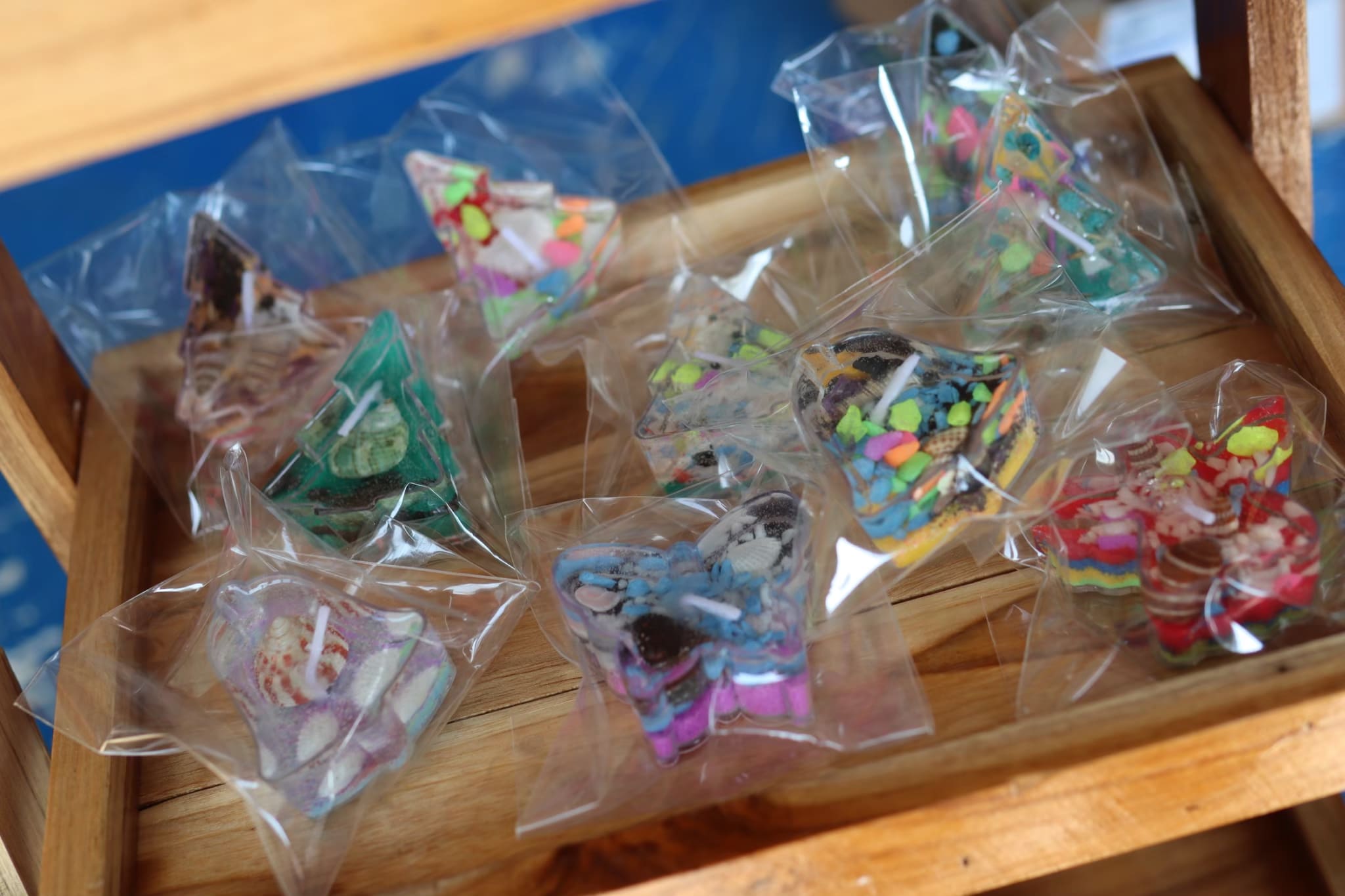 งานประดิษฐ์สุดสร้างสรรค์ ที่ใช้เจลใสเป็นสารตั้งต้น ละลายด้วยไฟอ่อน เติมสี น้ำหอม และตกแต่งด้วยของตกแต่งที่ไม่ติดไฟ เช่น ทรายสี เปลือกหอย หรือของจิ๋วต่างๆ