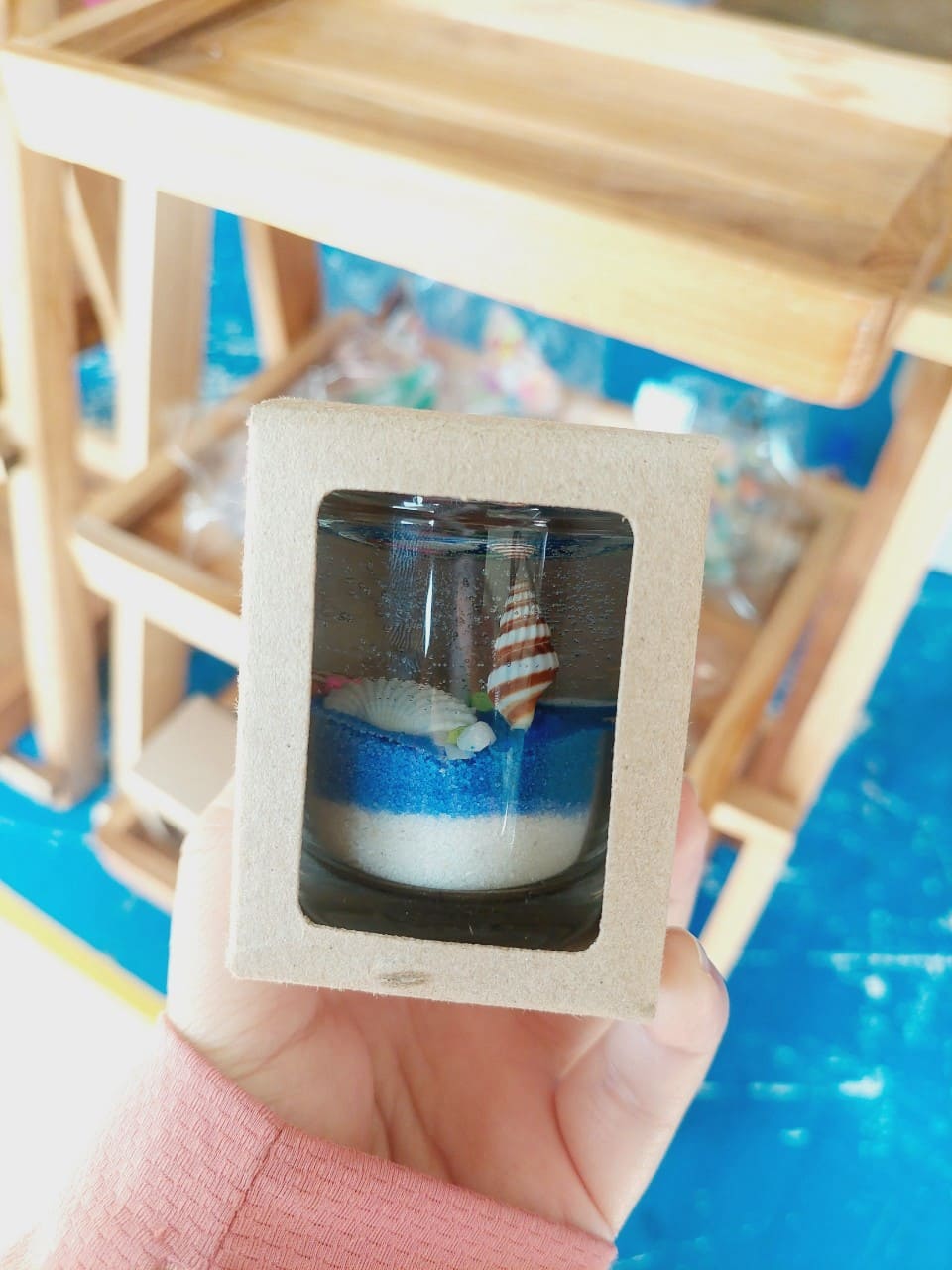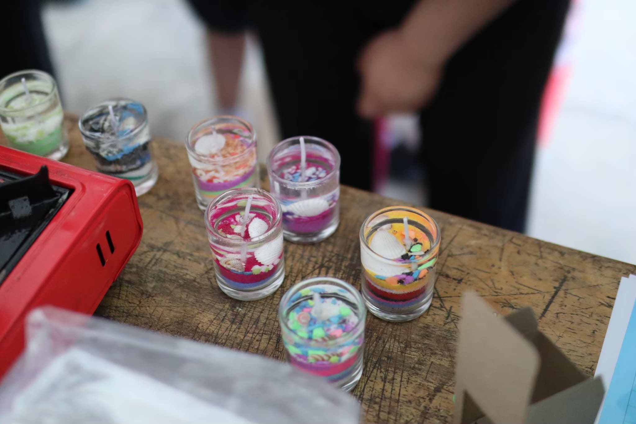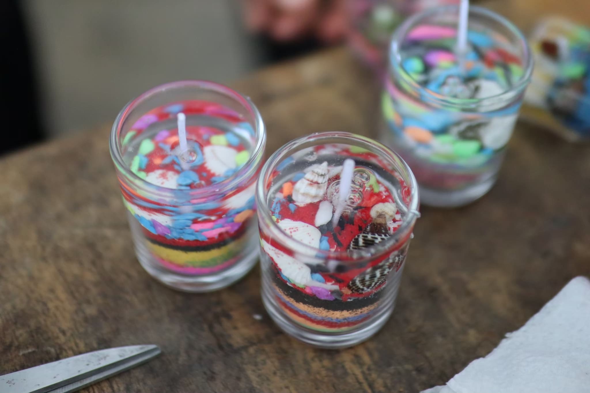 งานประดิษฐ์สุดสร้างสรรค์ ที่ใช้เจลใสเป็นสารตั้งต้น ละลายด้วยไฟอ่อน เติมสี น้ำหอม และตกแต่งด้วยของตกแต่งที่ไม่ติดไฟ เช่น ทรายสี เปลือกหอย หรือของจิ๋วต่างๆ